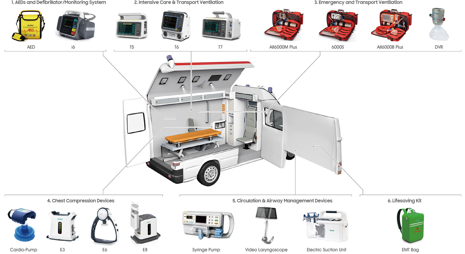 According to the 2010 AHA Guidelines for First Aid, when a sudden cardiac arrest occurs, a survival chain consisting of compression/airway/breath and defibrillation should be activated as soon as possible. This survival chain is C-A-B-D. Pre-hospital emergency treatment is a critical aspect of emergency medicine. The administration of first aid promptly and effectively is essential to ensure patient safety. The ability to respond quickly in emergency situations is vital to saving lives and reducing disability and mortality rates. Fortunately, Amoul® specializes in delivering comprehensive solutions for first aid and life support. The broad range of life support devices and emergency care solutions is based on the C.A.B.D life chain proposed by AHA. Amoul®'s tailored ambulance comprehensive solution helps medical staff carry out emergency work more efficiently and effectively. The reliable and innovative devices ensure timely and effective pre-hospital emergency care.